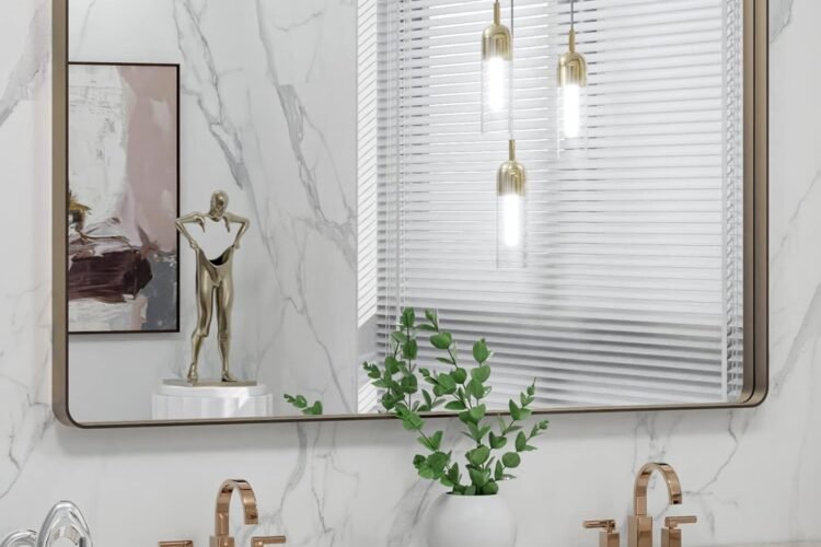 The LOAAO 48″ x 30″ Bronze Bathroom Mirror features a modern rounded rectangle shape and a brushed bronze metal frame that looks elegant and fits many interior styles — from contemporary to farmhouse and minimalist. It’s a large mirror that adds both function and flair to your space.
